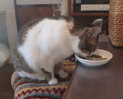 この間はどうしたことか 陸山母さんは椅子に座ってテーブルでカリカリを食べていました 自分はヒトだと思っているのかニャア~ でも人見知りで困るんです 人見知りを子供たちも受け継いで、一家揃って人見知りなのですよ 数日前 庭師さんが年1回の庭木の剪…